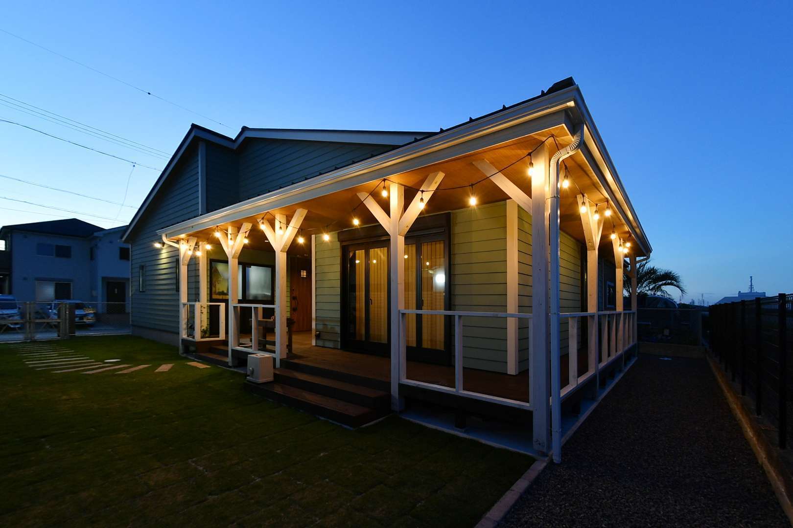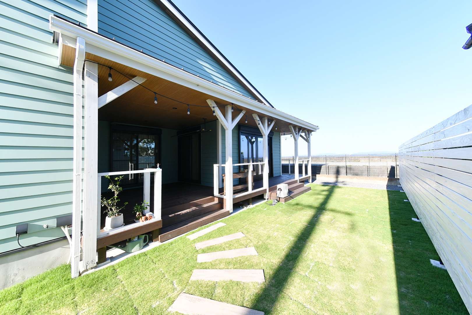 お庭の芝生と玄関を繋ぐ玄関アプローチは広々とした空間で、床はウッドデッキになっている。洗濯物も干せるようになっており、囲われた空間なので潮風を防げたり、外からの視線も気にしなくて済むという。また、この場所でもBBQが楽しめるので、天候が悪い日でも安心 。