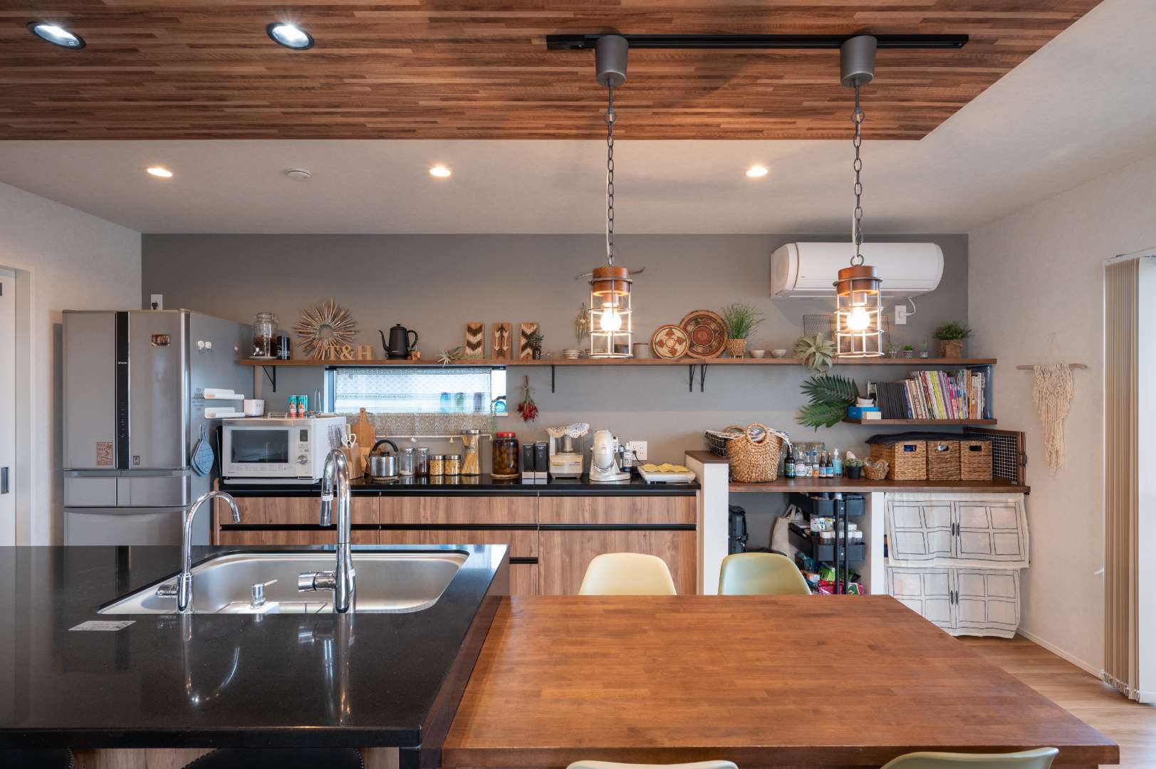 ふたり暮らしなので収納は少なめで良いと考え、カップボードの収納は下段のみ。収納の扉はお部屋の雰囲気に合わせて木目にした。上は見せる収納にし、H様が趣味で作っている小物でコーディネートしている、オシャレなカフェのような空間だオシャレ。