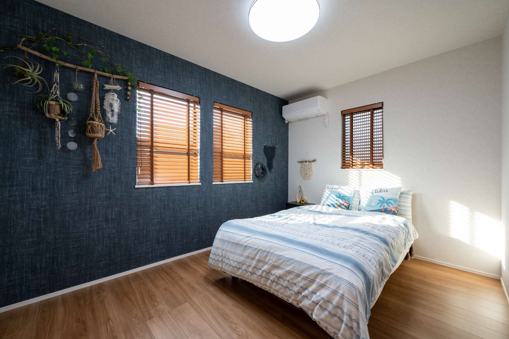 家族や友人が宿泊できるように造った主寝室に隣接の洋室。LDKやお庭から一番離れた場所なので、生活音も聞こえにくく、静かに休んでもらえる場所だ。空間の広がりを感じられるようにクローゼットには扉をつけず、ロールスクリーンを採用している